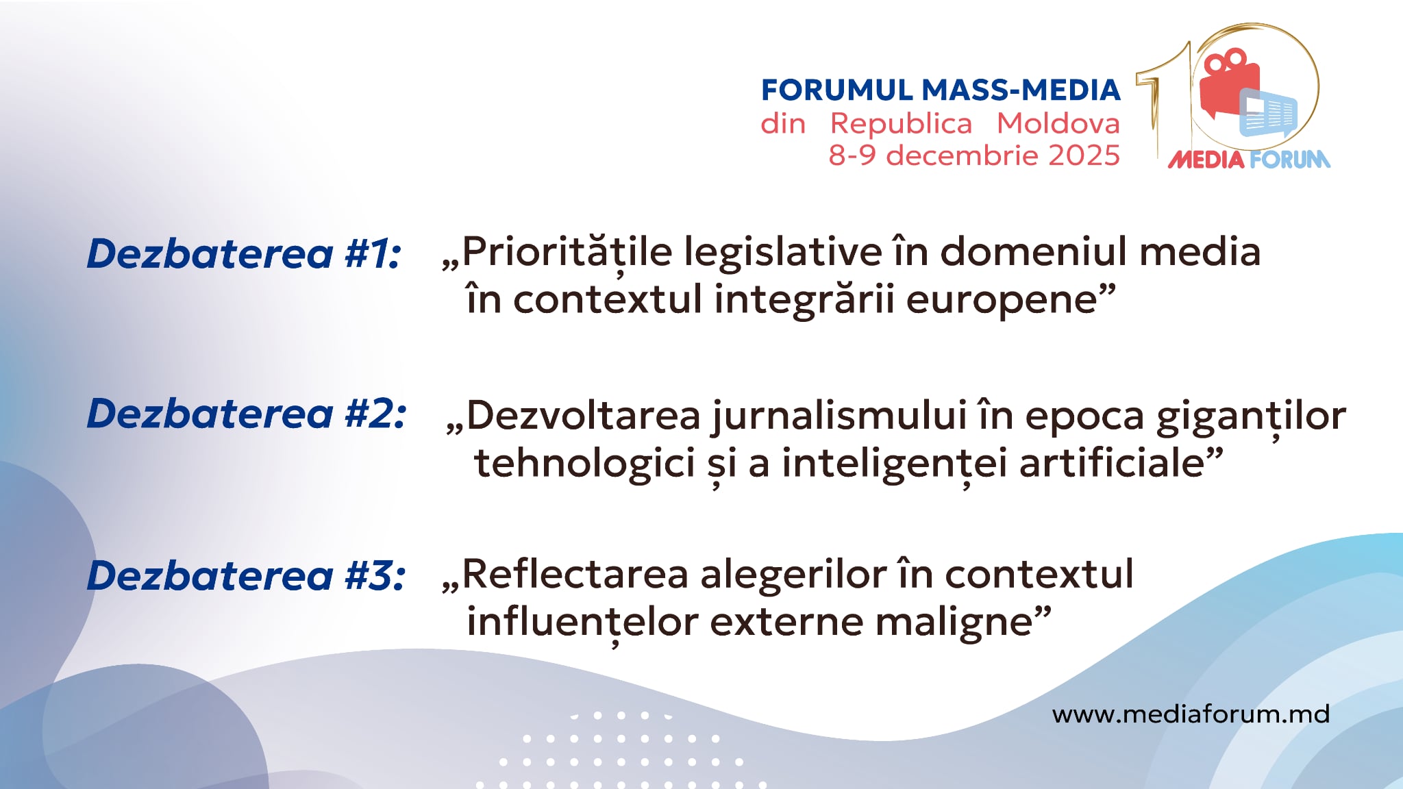 În agenda celei de-a 10 ediții a Forumului Mass-Media, care va avea loc pe 8 și 9 decembrie 2025 la Chișinău, sunt incluse șase dezbateri pe teme actuale pentru comunitatea jurnalistică moldovenească, de la îmbunătățirea cadrului legislativ care reglementează domeniul până la consolidarea sustenabilității instituțiilor de presă. La dezbateri vor participa experți locali și internaționali, reprezentanți ai autorităților, jurnaliști și manageri media.