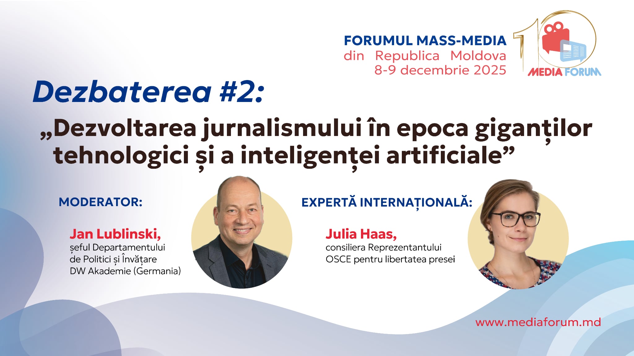 Va urma dezbaterea „Dezvoltarea jurnalismului în epoca giganților tehnologici și a inteligenței artificiale”, la care vor fi prezentate concluziile unui recent document de politici media, elaborat sub egida OSCE. Întitulat „Protejarea libertății presei în era platformelor Big Tech și a inteligenței artificiale”, documentul detaliază modul în care giganții tehnologici influențează vizibilitatea informațiilor de interes public, cu accent pe necesitatea unor reguli suplimentare clare de protecție a libertății presei în mediul digital. Totodată, sunt listate măsurile necesare pentru a spori siguranța jurnaliștilor pentru a limita violența, atacurile și hărțuirea în spațiul online. Studiul va fi prezentat de Julia Haas, consiliera Reprezentantului OSCE pentru Libertatea Presei, cunoscută expertă specializată în relații internaționale și în intersecția dintre tehnologie, securitate și drepturile omului. Julia face parte din Consiliul consultativ al Forumului de la Viena pentru Democrație și Drepturile Omului și este doctorandă în impactul inovațiilor digitale asupra libertății presei. Dezbaterea va fi moderată de Jan Lublinski, șeful Departamentului de Politici și Învățare DW Akademie (Germania).